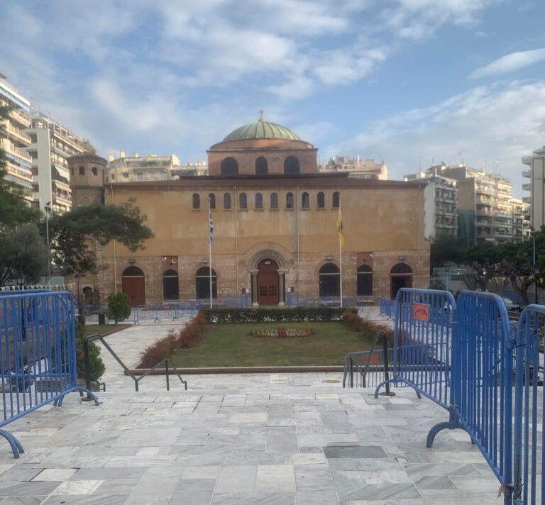 Έξω από τον ναό της Του Θεού Σοφίας τοποθετήθηκαν προστατευτικά κιγκλιδώματα για λόγους ασφαλείας, ενώ ειδικές κορδέλες της Τροχαίας έχουν τοποθετηθεί περιμετρικά λόγω των ειδικών κυκλοφοριακών ρυθμίσεων που θα εφαρμοστούν.