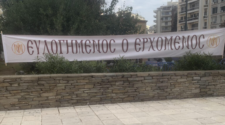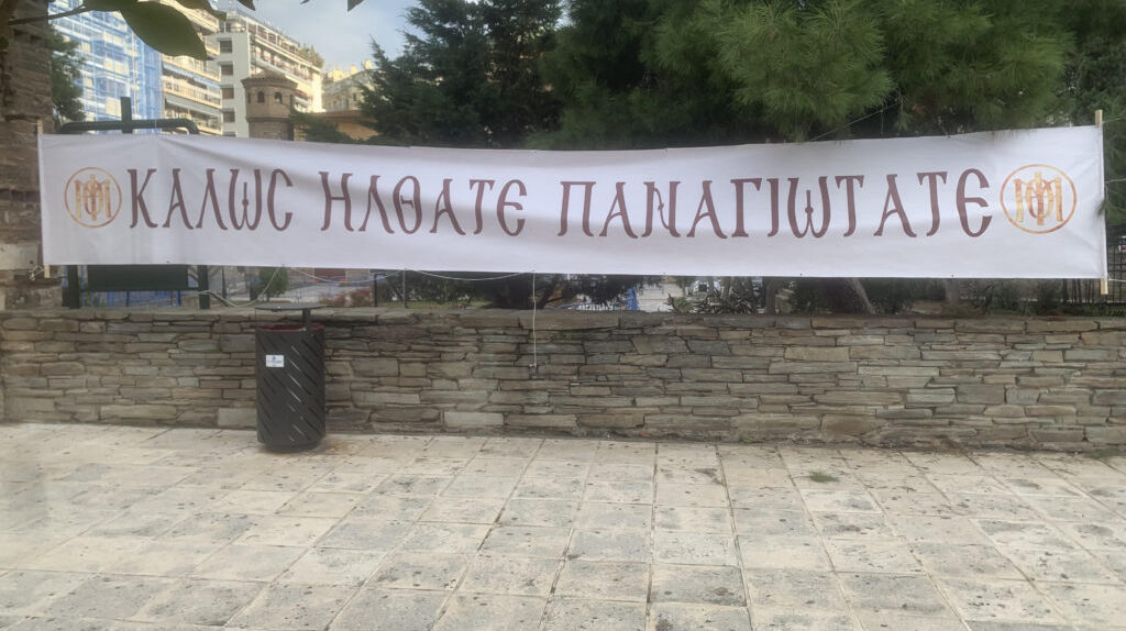 Στον εξωτερικό χώρο της εκκλησίας αναρτήθηκαν και πανό, που αναγράφουν «Καλώς ήρθατε Παναγιώτατε» και «Ευλογημένος ο ερχόμενος» για το καλωσόρισμα στον νέο Μητροπολίτη.