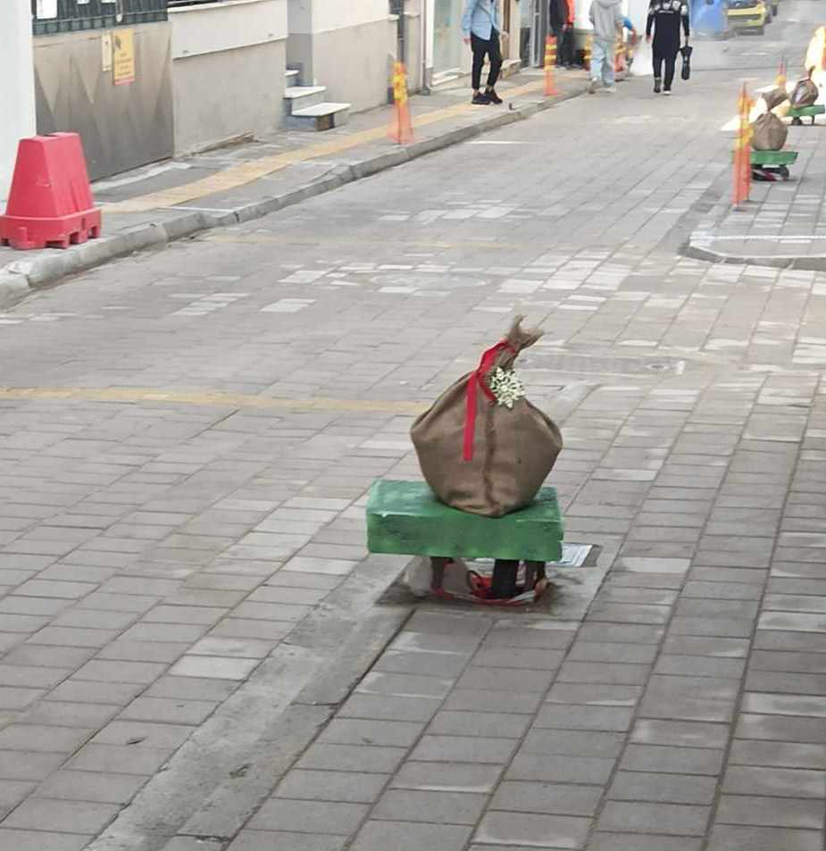 Μάλιστα η εγκατάσταση του ηλεκτροφωτισμού μάλλον θα καθυστερήσει αρκετά και θα πάει μετά τις γιορτές, οπότε οι υπεύθυνοι του Δήμου σκέφτηκαν να τοποθετήσουν σακιά με στολίδια, εκεί που θα έπρεπε να είχαν τοποθετηθεί οι κολόνες και ο δρόμος παρουσιάζει την εικόνα που βλέπετε στις φωτογραφίες.