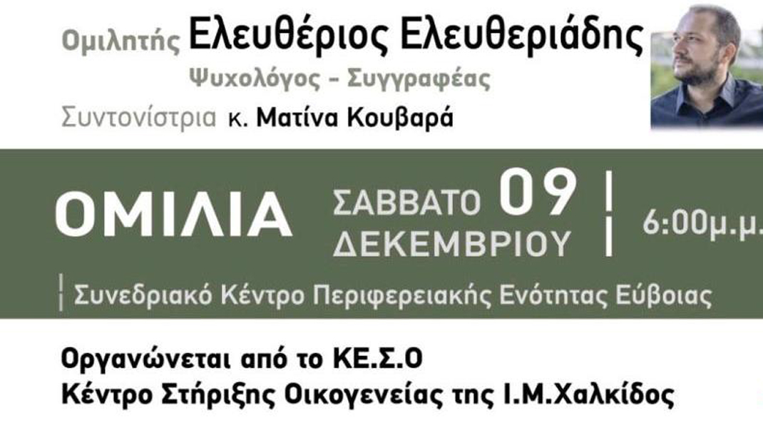 Το Κέντρο Στήριξης Οικογένειας της Μητρόπολης Χαλκίδας διοργανώνει εκδήλωσν με τίτλο "Καιρός να ξαναβρεθούμε" και βασικό ομιλητή τον Ελευθέριο Ελευθεριάδη, ψυχολόγο - συγγραφέα.