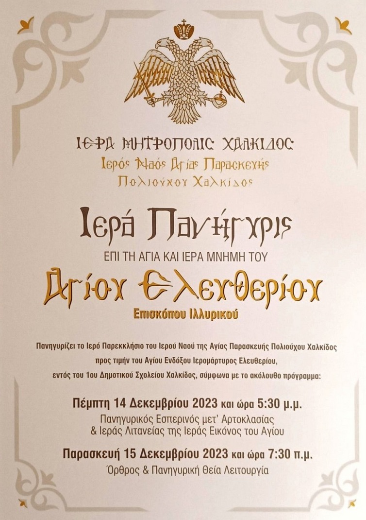 Το παρεκκλήσι του Αγίου Ελευθερίου, που βρίσκεται στο προαύλιο του 1ου Δημοτικού Σχολείου Χαλκίδας και ανήκει στην Ενορία της Αγίας Παρασκευής πανηγυρίζει σύμφωνα με το παρακάτω πρόγραμμα: