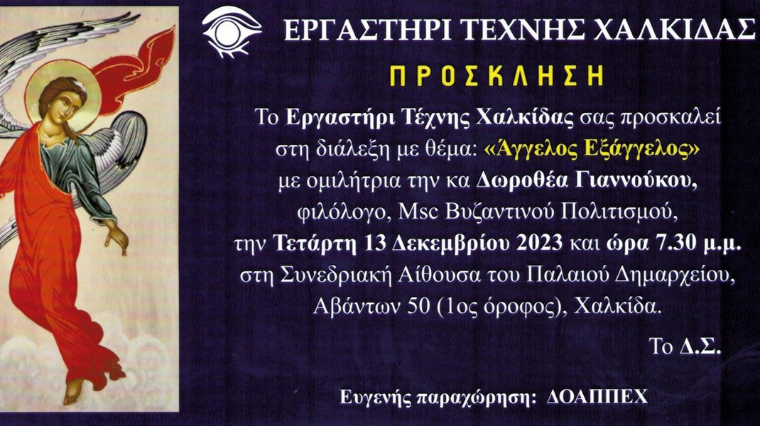 Το Εργαστήρι Τέχνης Χαλκίδας διοργανώνει ημερίδα με θέμα «Άγγελος Εξάγγελος», με ομιλήτρια την Δωροθέα Γιαννούκου.