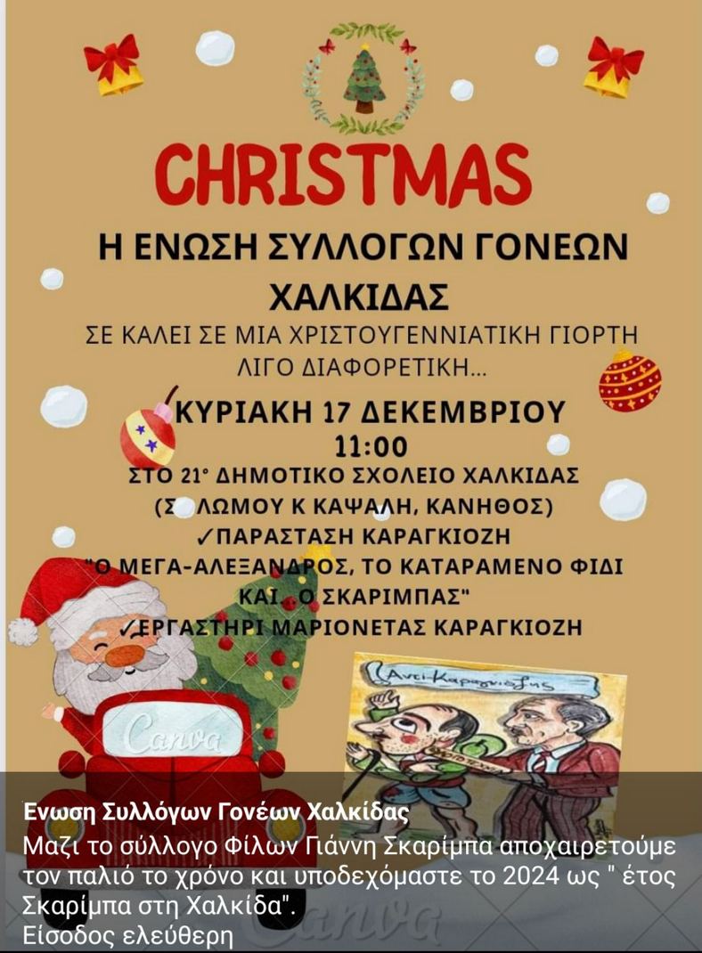 το Σύλλογο Φίλων Γιάννη Σκαρίμπα την Κυριακή 17 Δεκεμβρίου, στις 11 πρωί, στο 21ο δημοτικό σχολείο Χαλκίδας.