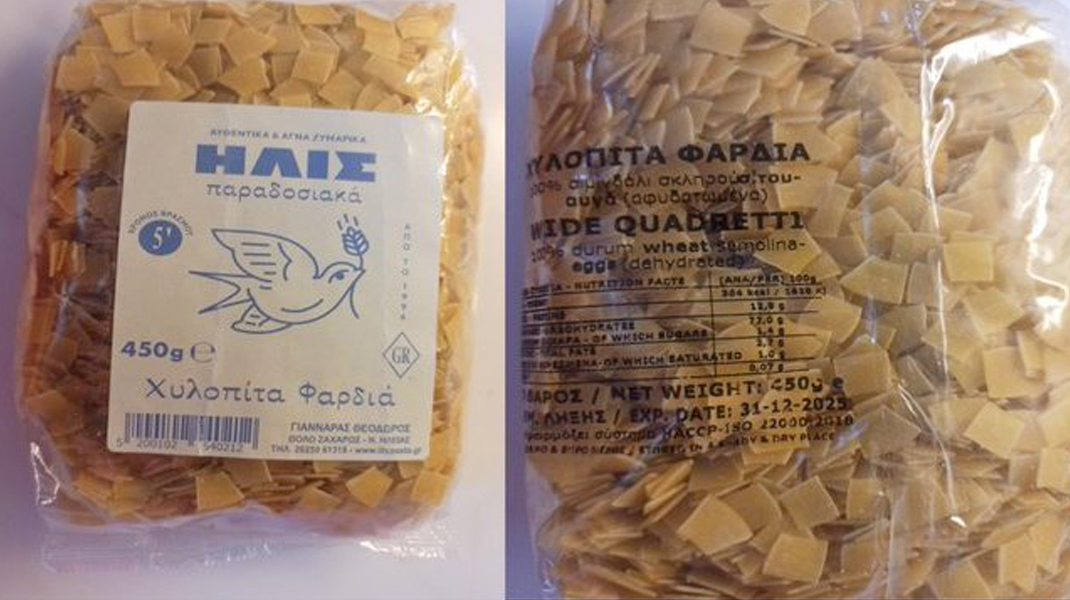 Ο Ενιαίος Φορέας Ελέγχου Τροφίμων (ΕΦΕΤ) ανακαλεί ζυμαρικά λόγω πιθανής παρουσίας αλλεργιογόνου συστατικού γάλακτος.