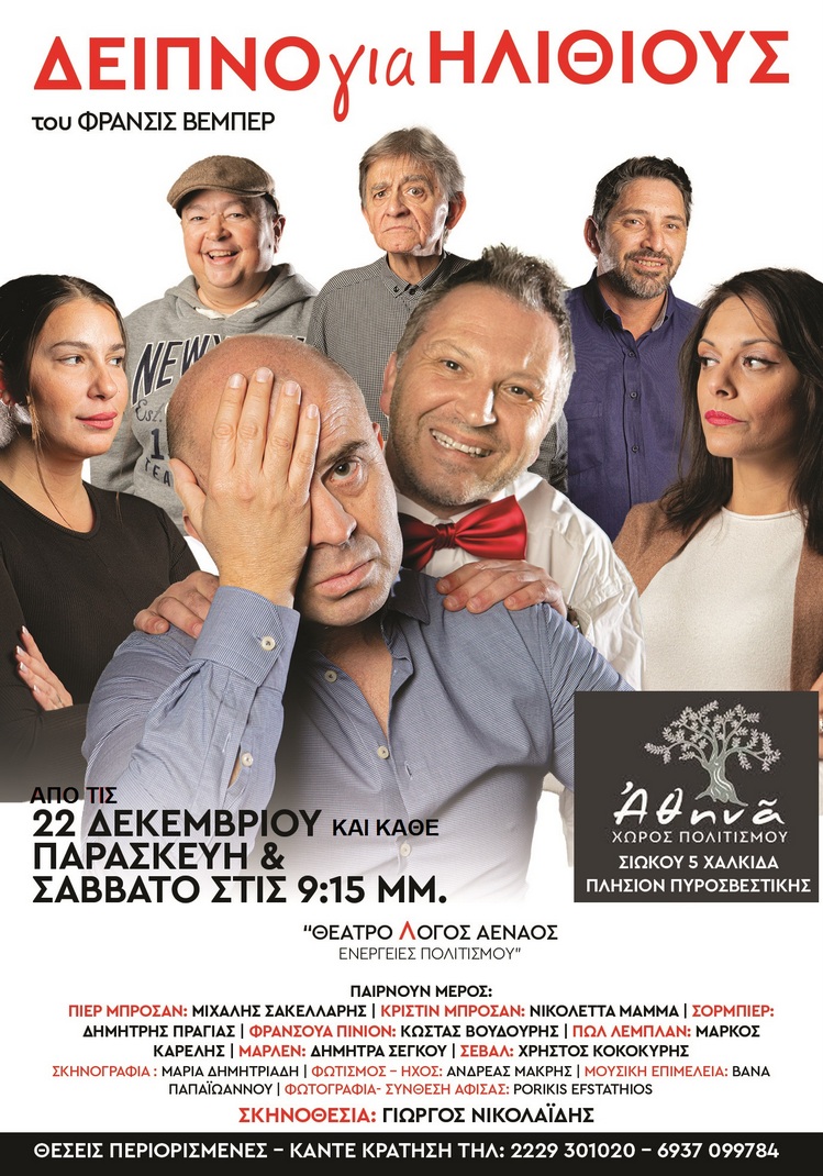 Φέτος, παρουσιάζεται η κωμωδία του Φράνσις Βέμπερ "Δείπνο για Ηλίθιους", κάθε Παρασκευή και Σάββατο, στις 9:15 το βράδυ, στον χώρο πολιτισμού "Αθηνά" (οδός Σιώκου 5, Χαλκίδα).