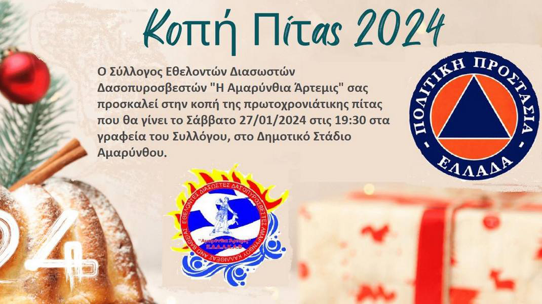 Ο Σύλλογος Εθελοντών Διασωστών Δασοπυροσβεστών " Αμαρύνθια Άρτεμις" διοργανώνει εκδήλωση, για την κοπή της πρωτοχρονιάτικης πίτας, το Σάββατο 27 Ιανουαρίου, στις 7:30 το απόγευμα, στα γραφεία του Συλλόγου, στο Δημοτικό Στάδιο Αμαρύνθου.