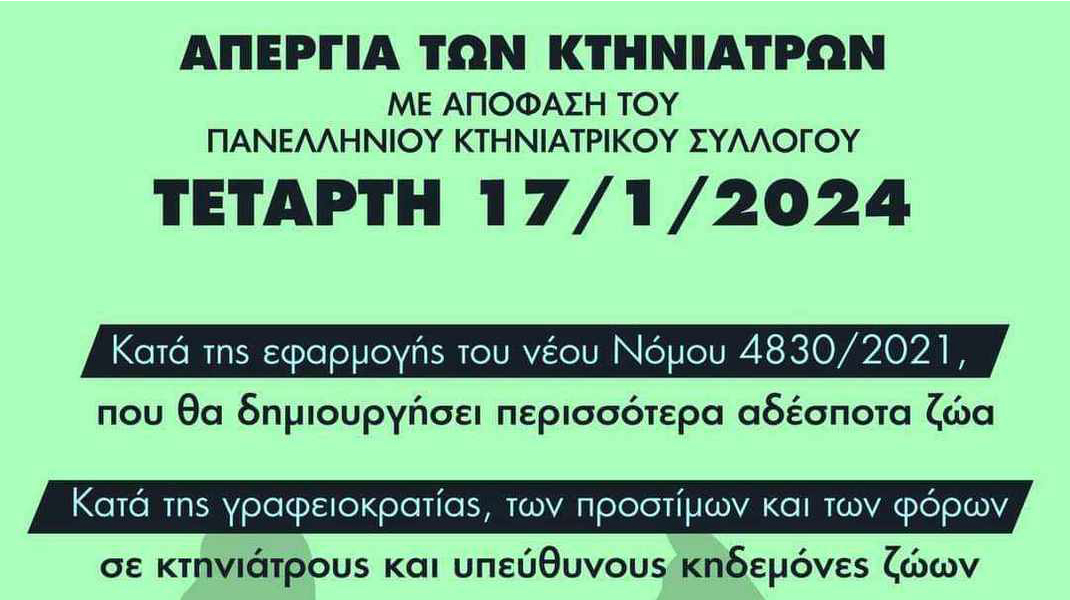 Απεργούν οι κτηνίατροι την Τετάρτη 17 Ιανουαρίου