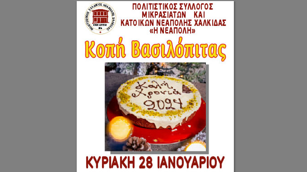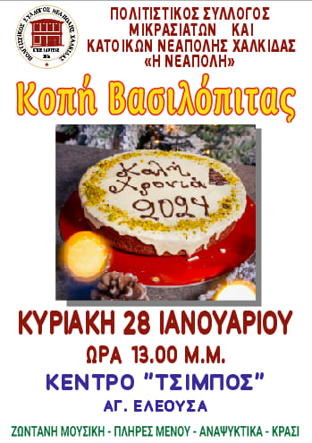 Ο Πολιτιστικός Σύλλογος Μικρασιατών και Κατοίκων Νεάπολης Χαλκίδας " Η Νεάπολη" διοργανώνει εκδήλωση για την κοπή της βασιλόπιτας, την Κυριακή 28 Ιανουαρίου, στη 1 το μεσημέρι, στο κέντρο "Τσίμπος", στην Αγία Ελεούσα.
