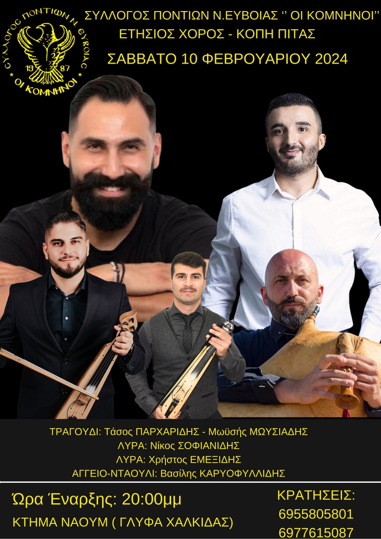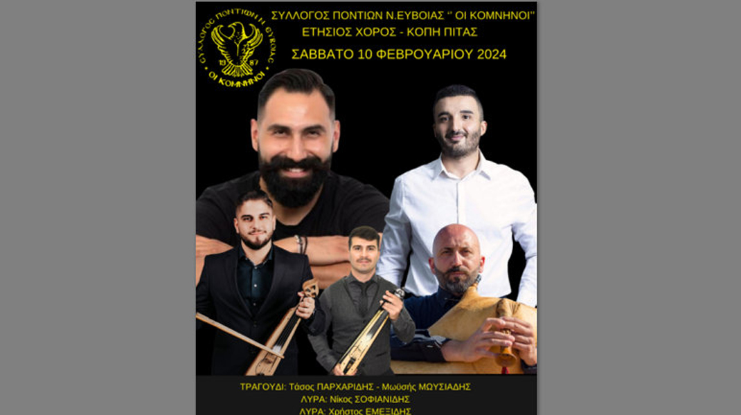 Το Διοικητικό Συμβούλιο του Συλλόγου Ποντίων Εύβοιας "Οι Κομνηνοί" διοργανώνει εκδήλωση για την κοπή της βασιλόπιτας, το Σάββατο 10 Φεβρουαρίου, στις 8 το βράδυ, στο κέντρο Ναούμ, στη Γλύφα Χαλκίδας.