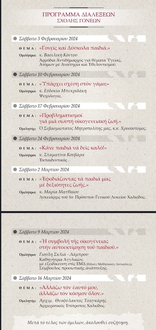 Ομιλίες στις Σχολές Γονέων της Μητρόπολης Χαλκίδος στο Πολιτιστικό - Πνευματικό της Κέντρο (οδός Αχαΐας και Κυκλάδων, Χαλκίδα).