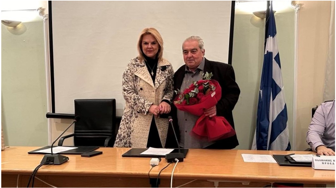 Η Δήμαρχος του έπλεξε το εγκώμιο και προσέφερε στον κ. Γιαννούκο μια ανθοδέσμη και ένα αναμνηστικό δώρο.