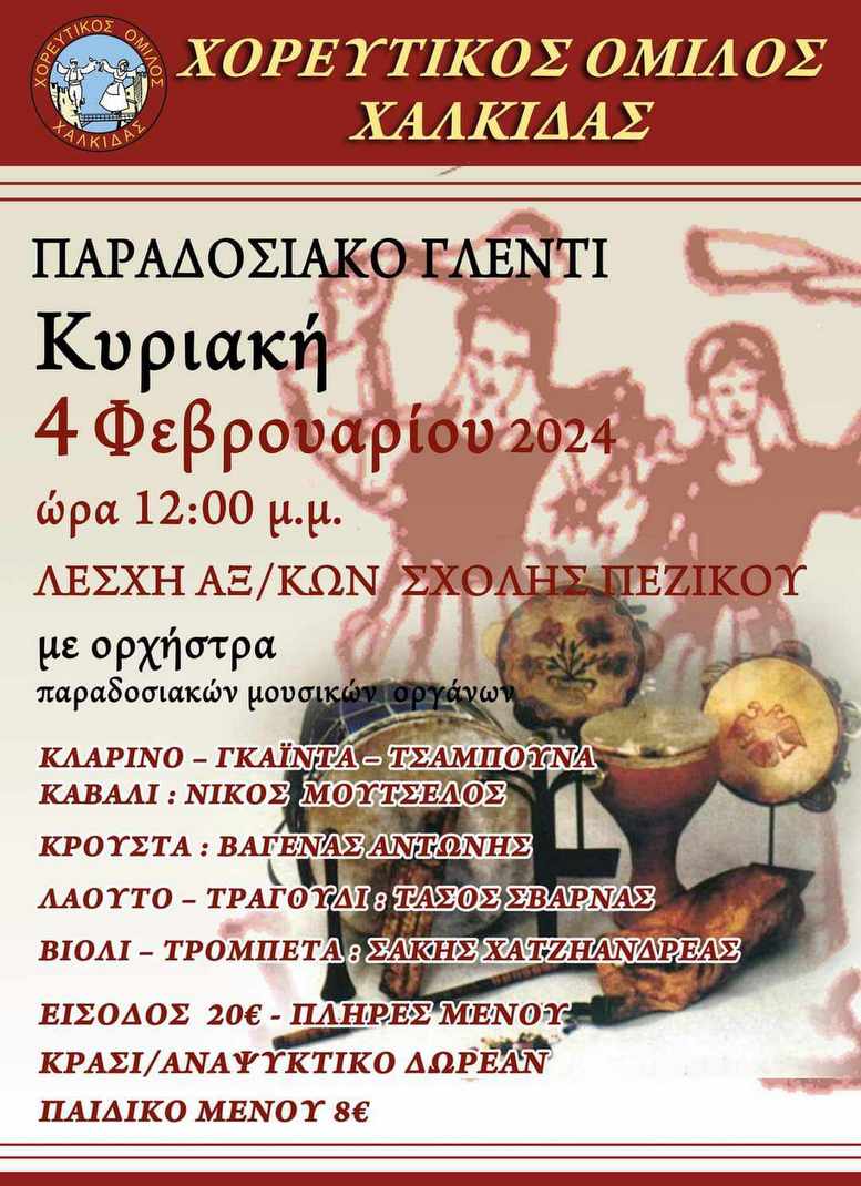 Ο Χορευτικός Όμιλος Χαλκίδας διοργανώνει παραδοσιακό γλέντι, με ορχήστρα παραδοσιακών μουσικών οργάνων, την Κυριακή 4 Φεβρουαρίου, στις 12 το μεσημέρι, στην αίθουσα της Λέσχης Αξιωματικών της Σχολής Πεζικού.