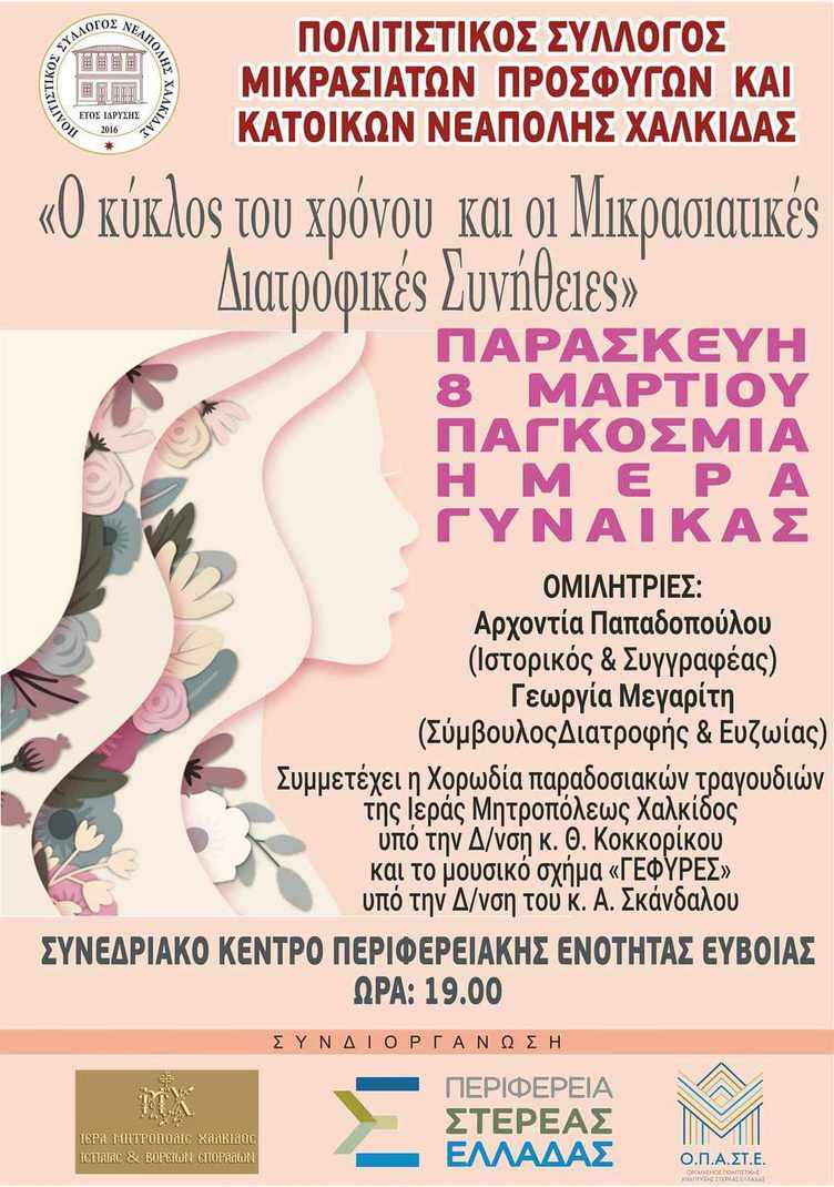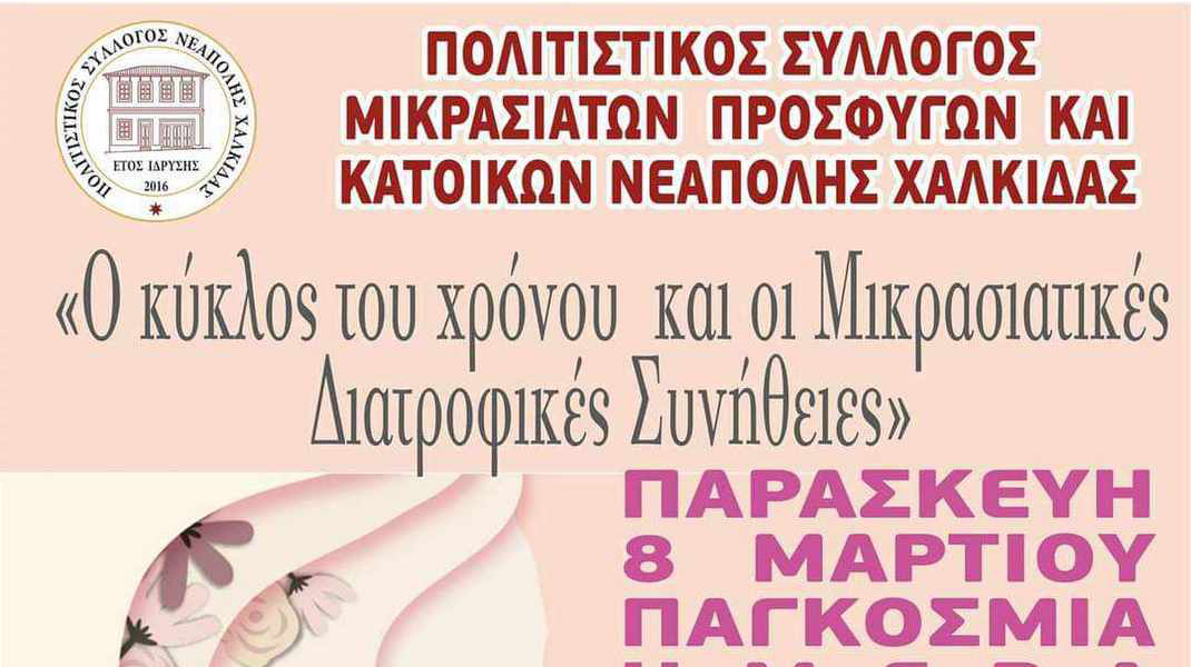 Ο Πολιτιστικός Σύλλογος Μικρασιατών Προσφύγων και κατοίκων Νεάπολης Χαλκίδας διοργανώνει εκδήλωση, με θέμα " Ο κύκλος του χρόνου και οι Μικρασιατικές Διατροφικές Συνήθειες".