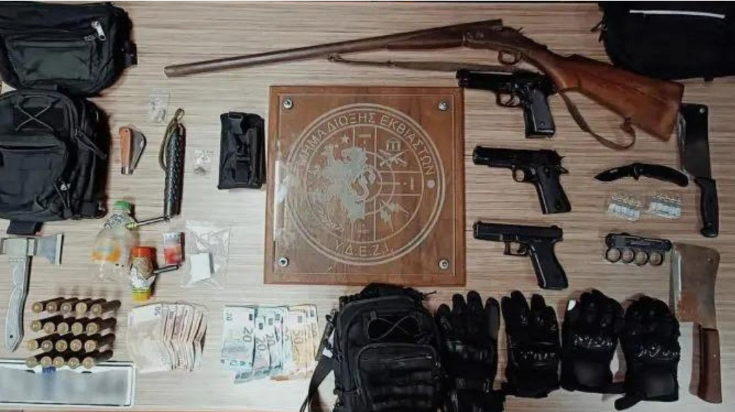 Μεταλλική σιδερογροθιά με ενσωματωμένο αναδιπλούμενο μαχαίρι, 3 μπαλτάδες, πτυσσόμενο γκλοπ, νάιλον συσκευασίες, που περιείχαν 1,5 γραμμάριο ακατέργαστης κάνναβης, αναδιπλούμενο μαχαίρι και αναδιπλούμενος σουγιάς, 3 αεροβόλα πιστόλια, τσεκούρι μεσαίου μεγέθους.