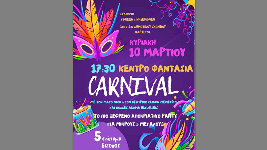 Ο Σύλλογος Γονέων και Κηδεμόνων 1ου και 2ου Δημοτικού Σχολείου Καρύστου διοργανώνει αποκριάτικο πάρτι, για γονείς και μαθητές, την Κυριακή 10 Μαρτίου, στο κέντρο "Φαντασία", με μάγο, κλόουν και πολλές εκπλήξεις.