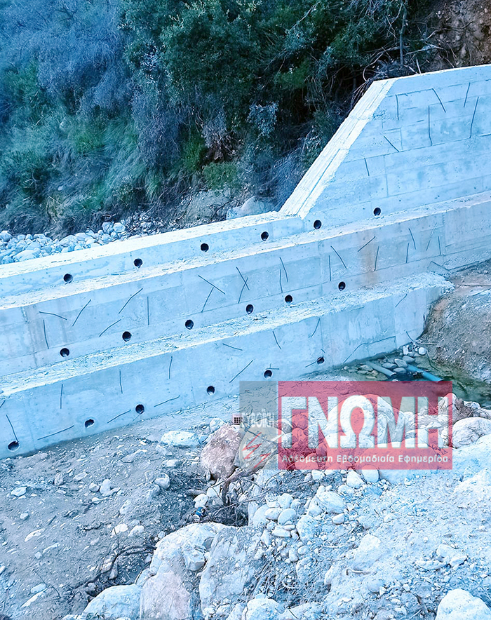 Το νέο φράγμα που κατασκευάστηκε πρόσφατα στο ποτάμι του Ασμηνίου, το οποίο, σύμφωνα με τον Γιάννη Κωνσταντινίδη, απειλεί με πλημμύρα το χωριό.