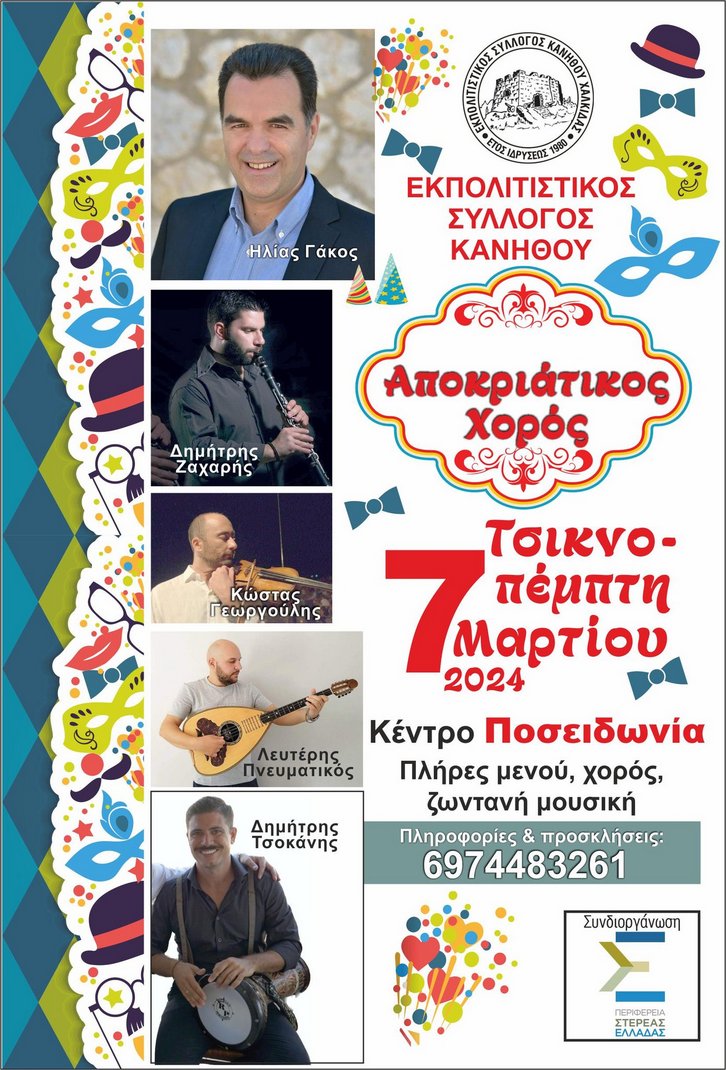 Ο Εκπολιτιστικός Σύλλογος Κανήθου διοργανώνει τον αποκριάτικο χορό του, την Τσικνοπέμπτη 7 Μαρτίου, στις 9 το βράδυ στο κέντρο "Ποσειδωνία", στην περιοχή της Κανήθου.