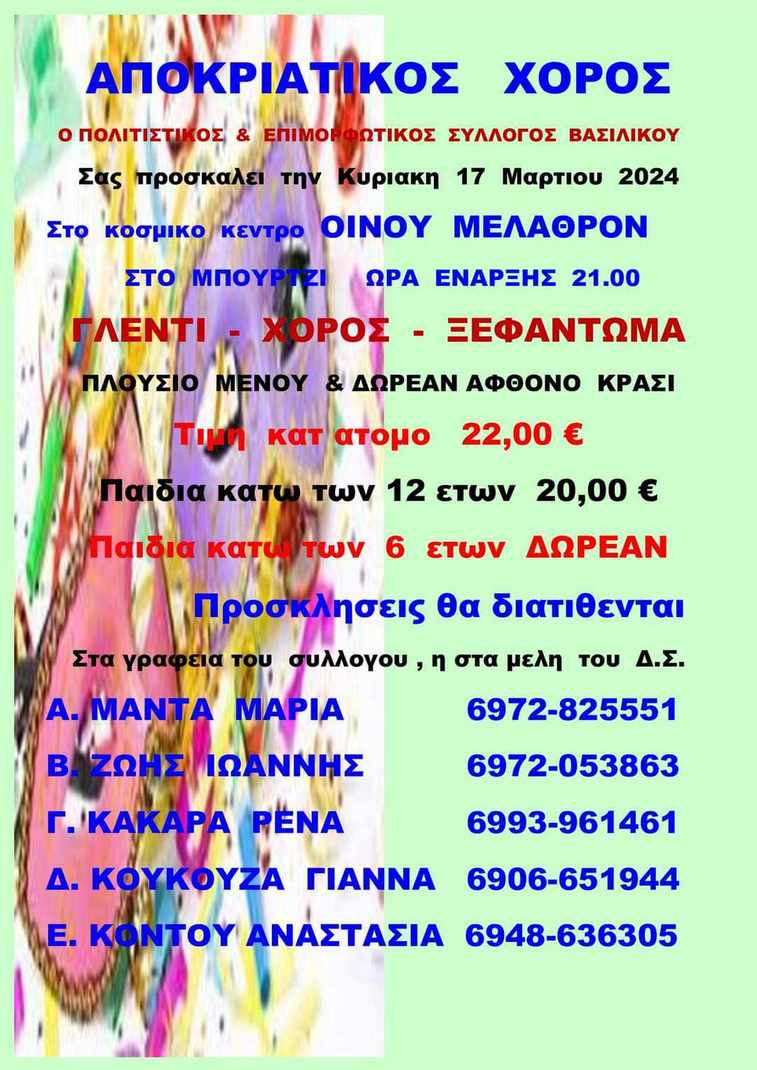 Ο Πολιτιστικός και Επιμορφωτικός Σύλλογος Βασιλικού διοργανώνει αποκριάτικο χορό, το Σάββατο 17 Μαρτίου, στις 9 το βράδυ, στο κοσμικό κέντρο "Οίνου Μέλαθρον", στο Μπούρτζι Ληλαντίων.