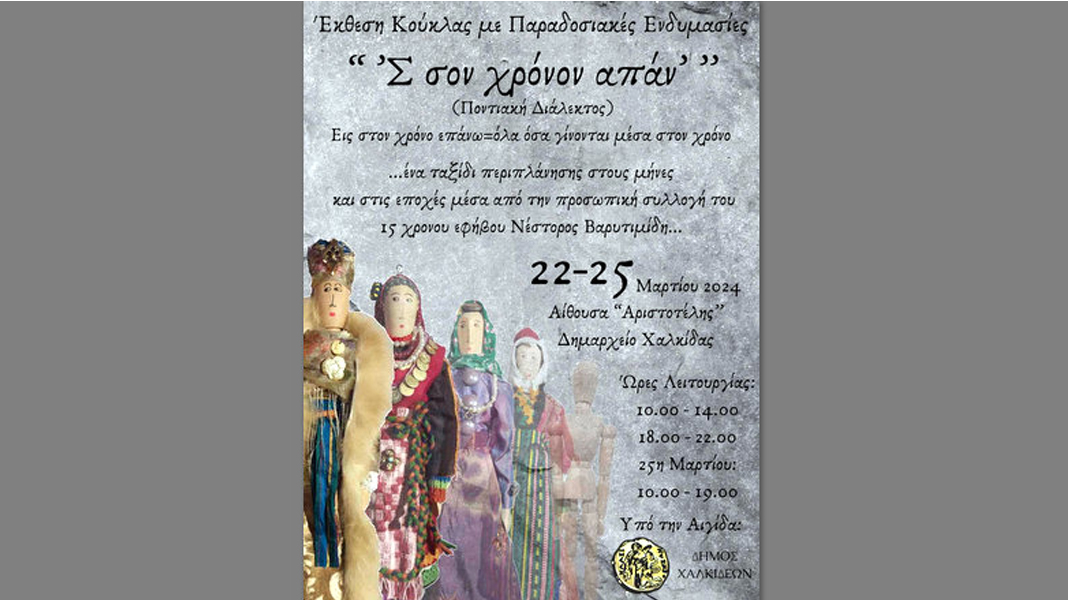 Μία ξεχωριστή έκθεση κούκλας με παραδοσιακές ενδυμασίες θα πραγματοποιηθεί στην ισόγεια αίθουσα "Αριστοτέλης", του Δημαρχείου Χαλκίδας, το τετραήμερο 22-23-24-25 Μαρτίου.