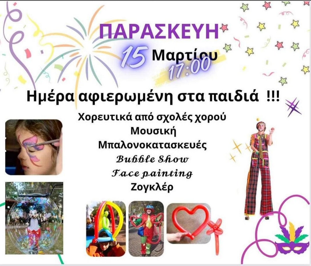 Η αποκριάτικη εκδήλωση έχει γενικό τίτλο "Ημέρα αφιερωμένη στα παιδιά". Περιλαμβάνει χορευτικά δρώμενα, μπαλονοκατασκευές, Bubble show, Face painting, ζογκλέρ και άλλες δράσεις.