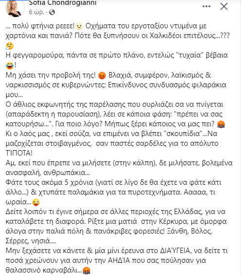Η πρώην αντιδήμαρχος και νυν περιφερειακή σύμβουλος Σοφία Χονδρογιάννη, με ανάρτησή της στα Μέσα Κοινωνικής Δικτύωσης, ασκεί σκληρή κριτική στις καρναβαλικές εκδηλώσεις του Δήμου Χαλκιδέων.