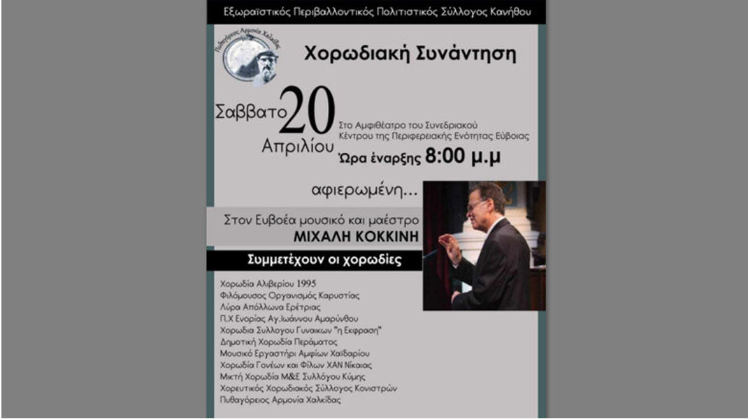 Ο Εξωραϊστικός - Περιβαλλοντικός - Πολιτιστικός Σύλλογος Κανήθου διοργανώνει Χορωδιακή Συνάντηση, το Σάββατο 20 Απριλίου, στις 8 το βράδυ, αφιερωμένη στον Ευβοέα μουσικό και μαέστρο Μιχάλη Κοκκίνη.