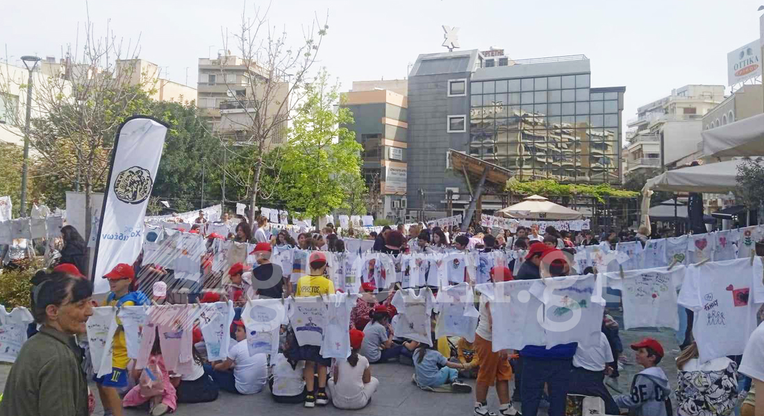 Εκατοντάδες παιδιά σχολείων του Δήμου Χαλκιδέων συγκεντρώθηκαν στην πλατεία δικαστηρίων το πρωί της Τετάρτης 17 Απριλίου και κρέμασαν σε σύρματα μπλουζάκια για τα παιδιά με καρκίνο, τα οποία ζωγράφισαν μόνα τους.