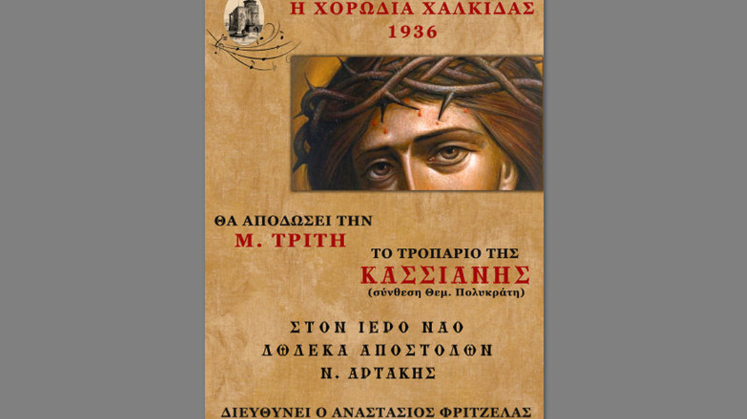Η Χορωδία Χαλκίδας 1936 πιστή για ακόμα μια χρονιά στο ραντεβού της, θα αποδώσει το Τροπάριο της Κασσιανής, σε σύνθεση Θεμ. Πολυκράτη, την Μεγάλη Τρίτη 30 Απριλίου.