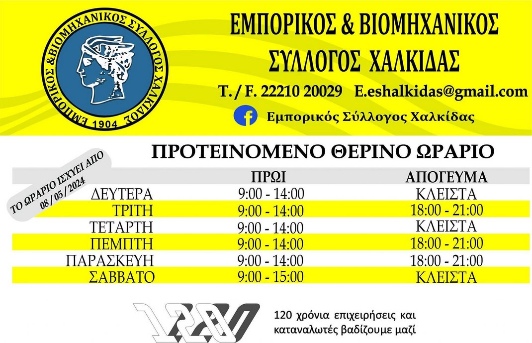 Από τον Εμπορικό Σύλλογο Χαλκίδας ανακοινώθηκε το προτεινόμενο θερινό ωράριο λειτουργίας των καταστημάτων της πόλης, το οποίο θα τεθεί σε ισχύ αμέσως μετά τις αργίες των ημερών του Πάσχα, δηλαδή την Τετάρτη 8 Μαΐου.