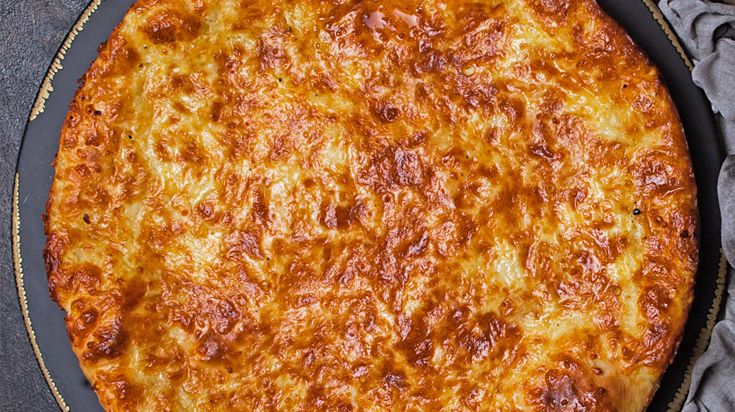 Σε ένα λαδωμένο στρογγυλό ταψί στρώνουμε ακτινωτά 5 φύλλα κρούστας (χωρίς να τα λαδώσουμε, καθώς από τα τυριά θα υπάρξει πολλή υγρασία) αφήνοντας τα φύλλα να εξέχουν αρκετά από το ταψί.