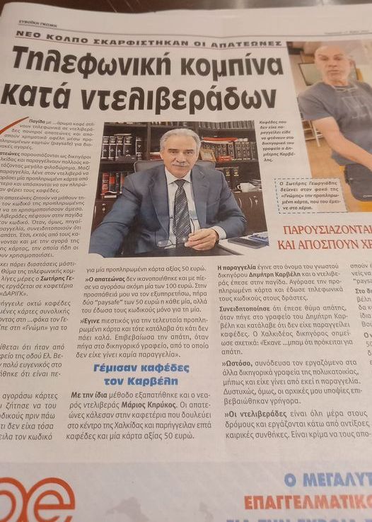 Συγκεκριμένα, στην εφημερίδα που κυκλοφορεί αυτή την εβδομάδα σε όλα τα σημεία πώλησης εφημερίδων της Εύβοιας, υπάρχει αποκαλυπτικό ρεπορτάζ για την δράση απατεώνων, οι οποίοι εξαπατούν ντελιβεράδες.