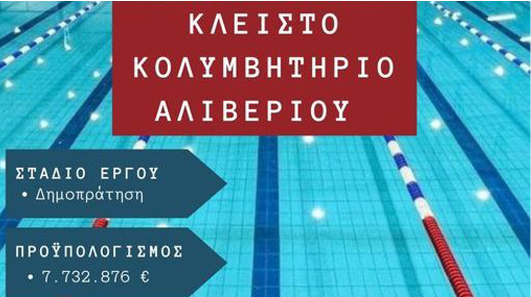 Το έργο της κατασκευής του Κλειστού Κολυμβητηρίου Αλιβερίου έχει ενταχθεί στο πρόγραμμα «Αντώνης Τρίτσης», με συνολικό προϋπολογισμό 7.732.876,34 ευρώ.