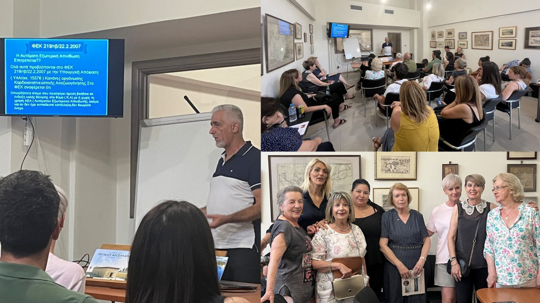 Η Έφορος Ελένη-Ρόζα Νικολάου και οι κυρίες-μέλη του Τμήματος είχαν την ευκαιρία να ακούσουν οδηγίες πρώτων βοηθειών, να δουν ενδιαφέρον σχετικό οπτικοακουστικό υλικό και να λάβουν απαντήσεις στα ερωτήματα τους.
