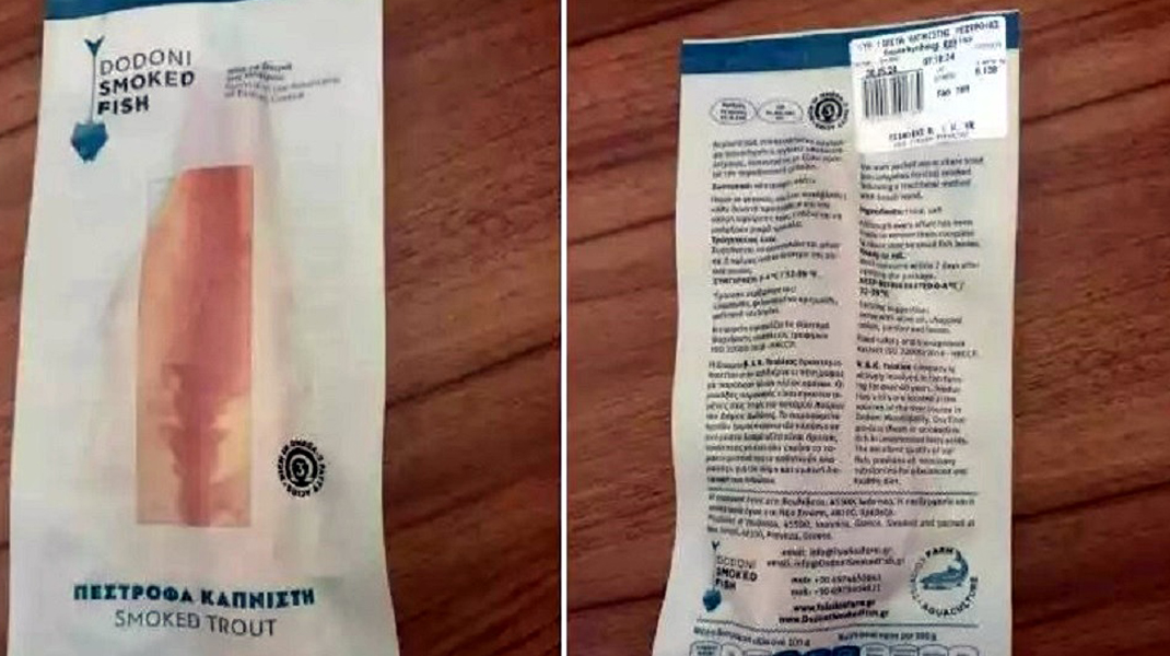 Σύμφωνα με την ανακοίνωση του ΕΦΕΤ, ο παθογόνος μικροοργανισμός Listeria monocytogenes εντοπίστηκε σε δείγμα καπνιστής πέστροφας, με την εμπορική ονομασία «ΠΕΣΤΡΟΦΑ ΚΑΠΝΙΣΤΗ DODONI» με αριθμό παρτίδας 01280524 και ημερομηνία λήξεως 07/10/2024.