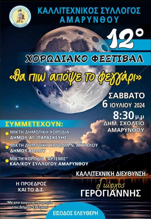 Ο Καλλιτεχνικός Σύλλογος Αμαρύνθου διοργανώνει το 12ο Χορωδιακό Φεστιβάλ, με τίτλο "Θα πιω απόψε το φεγγάρι", το Σάββατο 6 Ιουλίου, στις 8:30 το βράδυ, στο Δημοτικό Σχολείο Αμαρύνθου.