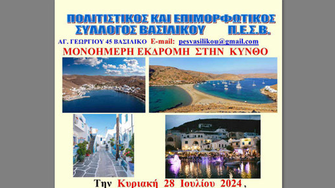 Ο Πολιτιστικός και Επιμορφωτικός Σύλλογος Βασιλικού διοργανώνει μονοήμερη εκδρομή στην Κύθνο, την Κυριακή 28 Ιουλίου. Η αναχώρηση θα γίνει με το λεωφορείο, από το γραφείο του συλλόγου ( Αγίου Γεωργίου 45, Βασιλικό), στις 5:30 το πρωί.