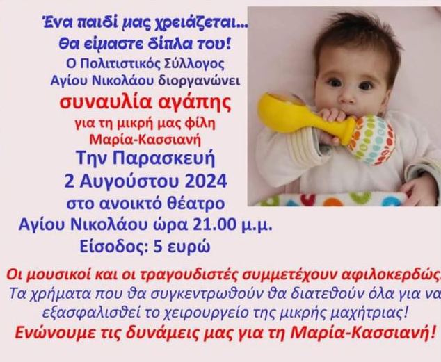 Δυο συναυλίες αγάπης θα γίνουν στο ανοιχτό θέατρο Αγίου Νικολάου (Μπούρτζι) με στόχο να μαζευτούν χρήματα για τη μικρή Μαρία - Κασσιανή από το Μπούρτζι, που χρειάζεται άμεσα επέμβαση στην καρδούλα της.