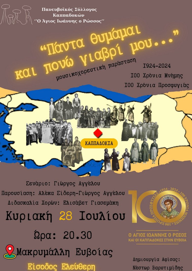 Μετά το πρώτο, εξαιρετικά επιτυχημένο σεργιάνι στο Νέο Προκόπιο, ο Πανευβοϊκός Σύλλογος Καππαδοκών ο Άγιος Ιωάννης ο Ρώσος παρουσιάζει για δεύτερη φορά την μουσικό- χορό- θεατρική παράσταση "Πάντα θυμάμαι και πονώ γιαβρί μου..."