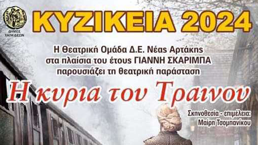 Η Θεατρική Ομάδα της Δημοτικής Ενότητας Νέας Αρτάκης, στο πλαίσιο του έτους Σκαρίμπα, παρουσιάζει στα φετινά Κυζίκεια, την παράσταση " Η κυρία του Τραίνου", σε σκηνοθεσία και επιμέλεια Μαίρης Τσομπανίκου.