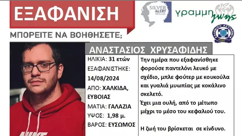 Συναγερμός έχει σημάνει στην Αστυνομία και τις συναρμόδιες Αρχές, για την εξαφάνιση 31χρονου από τη Χαλκίδα. Πρόκειται για τον Αναστάσιο Χρυσαφίδη, τα ίχνη του οποίου χάθηκαν από το σπίτι του, στη Χαλκίδα, τα ξημερώματα της Τετάρτης 14 Αυγούστου 2024.