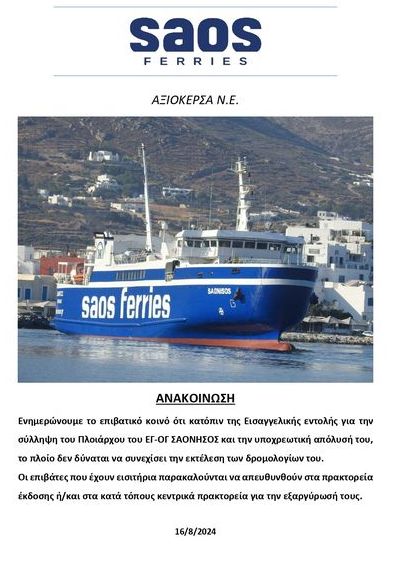 "Ενημερώνουμε το επιβατικό κοινό ότι, κατόπιν Εισαγγελικής εντολής για τη σύλληψη του Πλοιάρχου του ΕΓ-ΠΓ ΣΑΟΝΗΣΟΣ και την υποχρεωτική απόλυσή του, το πλοίο δεν μπορεί να συνεχίσει την εκτέλεση των δρομολογίων του.