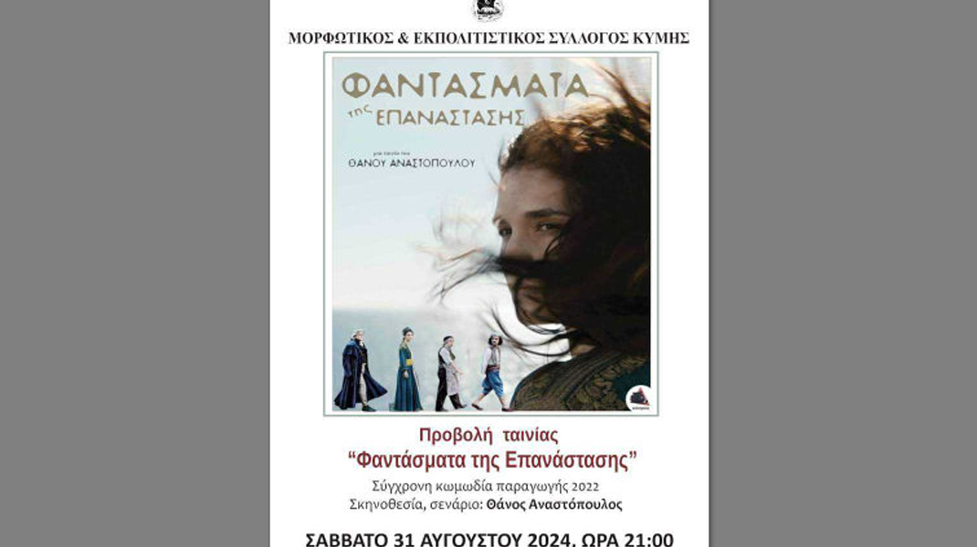 Στο πλαίσιο των θερινών εκδηλώσεων του Μορφωτικού και Εκπολιτιστικού Συλλόγου Κύμης, το Σάββατο 31 Αυγούστου, στις 9 το βράδυ, θα προβληθεί η ταινία "Φαντάσματα της Επανάστασης", στο Θέατρο του Λαογραφικού Μουσείου Κύμης.