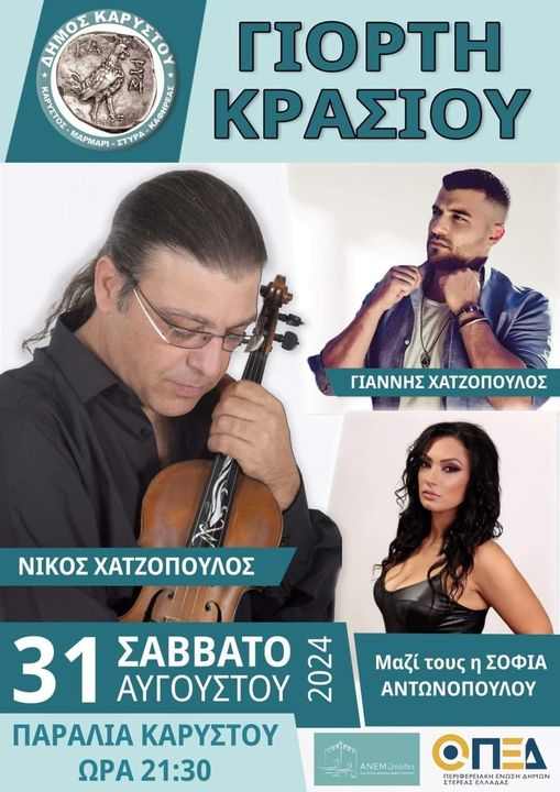 Ο Δήμος Καρύστου διοργανώνει Γιορτή Κρασιού, με λαϊκό γλέντι με ζωντανή μουσική, το βράδυ του Σαββάτου 31 Αυγούστου, στην παραλία της Καρύστου.