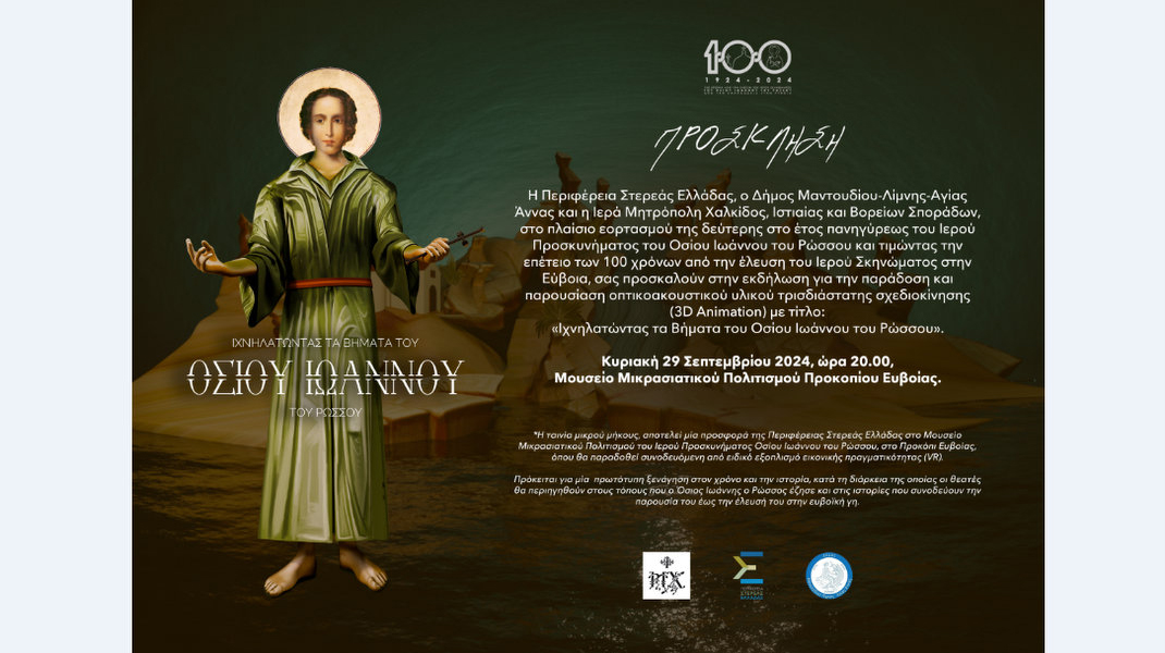 Συγκεκριμένα, θα γίνει παρουσίαση οπτικοακουστικού υλικού τρισδιάστατης σχεδιοκίνησης (3D Animation) με τίτλο «Ιχνηλατώντας τα βήματα του Οσίου Ιωάννου του Ρώσου», την οποία ετοίμασε η Περιφέρεια Στερεάς Ελλάδος, τιμώντας τα εκατό χρόνια από την έλευση του Οσίου Ιωάννη στην Εύβοια.
