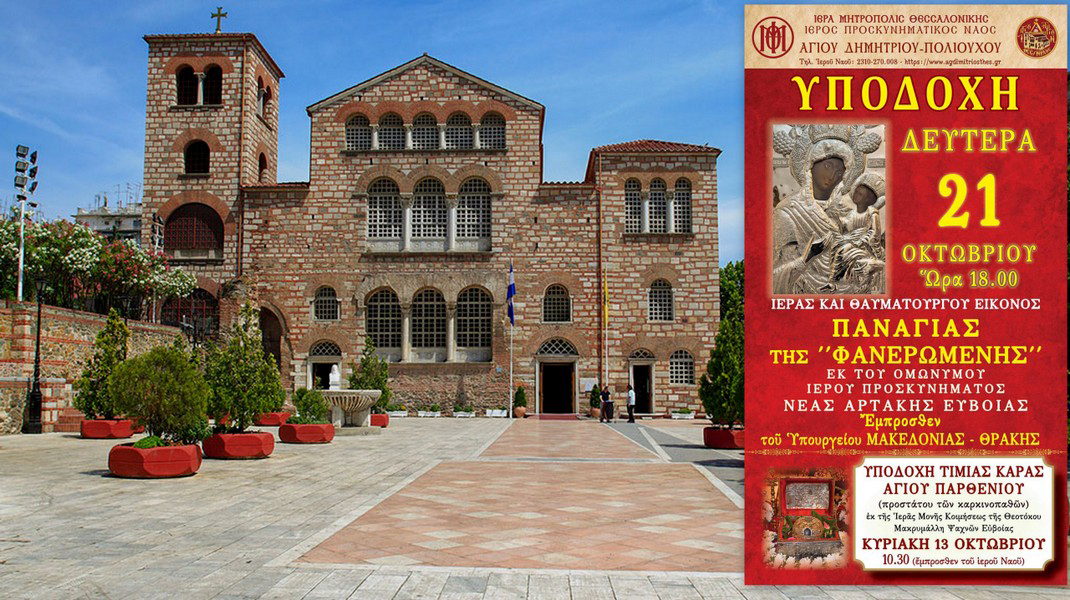Η υποδοχή της θαυματουργής εικόνας της Παναγίας Φανερωμένης θα γίνει την Δευτέρα 21 Οκτωβρίου, στις 6 το απόγευμα, μπροστά στο κτήριο του Υπουργείου Μακεδονίας - Θράκης.