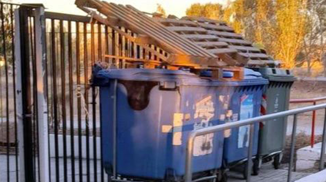 Μπροστά σε μία δυσάρεστη έκπληξη βρέθηκε η διευθύντρια του Γυμνασίου Ερέτριας κ. Θυμιοπούλου το πρωί της Τρίτης 8 Οκτωβρίου. Στις 7:10 που έφτασε στο σχολείο βρήκε την είσοδο φραγμένη με κάδους απορριμμάτων και παλέτες.
