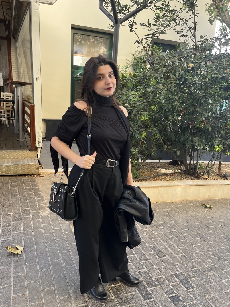 « Ξύπνησα με πολύ …dark mood και καθόλου διάθεση. Γι’ αυτό ντύθηκα σε total black. Πάω να συναντήσω τις φίλες μου να πιούμε ένα καφεδάκι.»