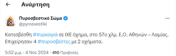 Κάτω από αδιευκρίνιστες συνθήκες, άρπαξε φωτιά ΙΧ αυτοκίνητο, το μεσημέρι της Δευτέρας 4 Νοεμβρίου, στο 57ο χιλιόμετρο της Εθνικής Οδού Αθηνών- Λαμίας, στο ύψος των Οινοφύτων.