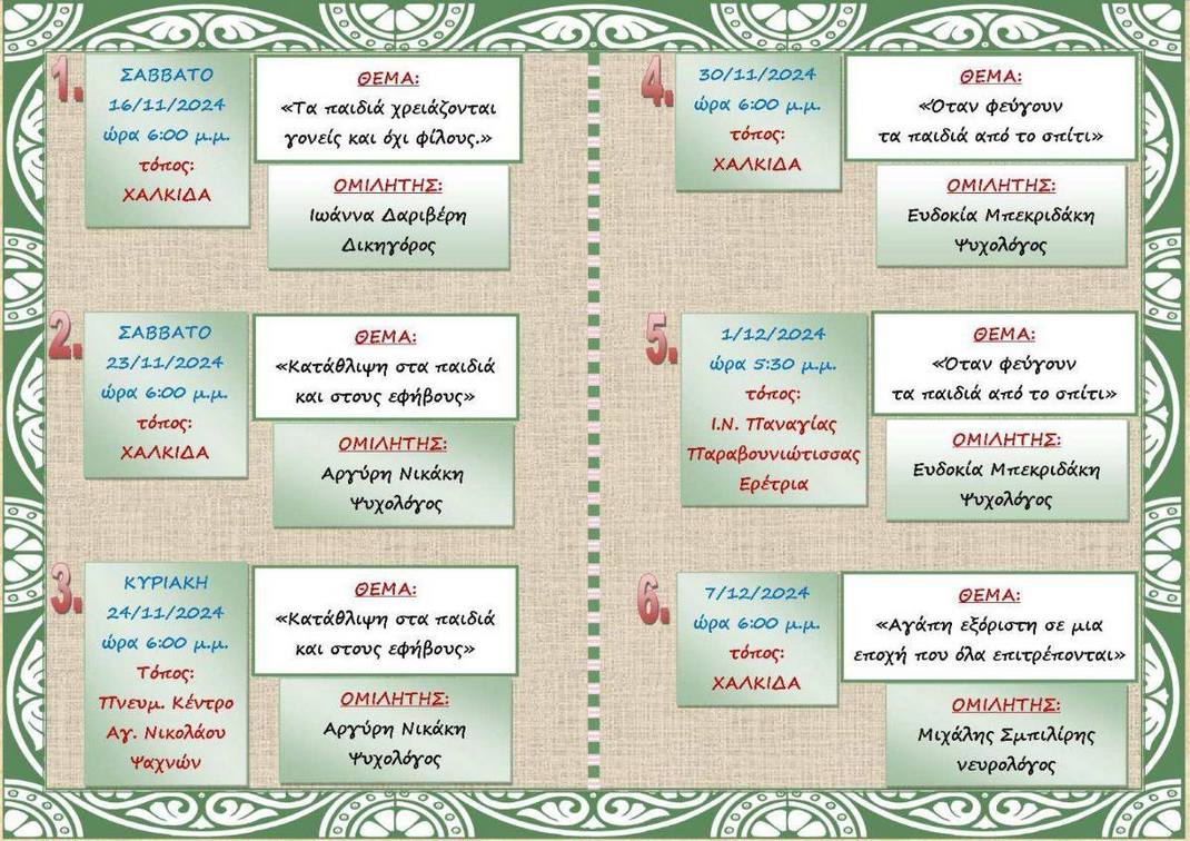 Στους πίνακες, που ακολουθούν μπορείτε να δείτε το πρόγραμμα των ομιλιών, στο πλαίσιο της Σχολής Γονέων: