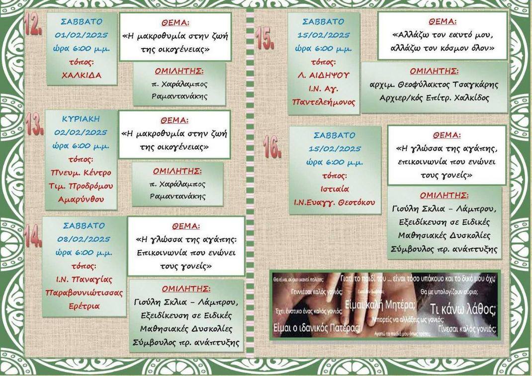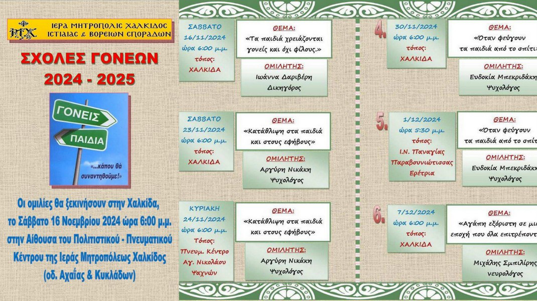 Αρχίζει και φέτος η λειτουργία της Σχολής Γονέων στην Μητρόπολη Χαλκίδος. Η έναρξη θα γίνει το Σάββατο 16 Νοεμβρίου, στις 6 το απόγευμα, στην Αίθουσα ομιλιών του Πολιτιστικού και Πνευματικού Κέντρου της Μητρόπολης, επί των οδών Αχαΐας και Κυκλάδων στη Χαλκίδα.